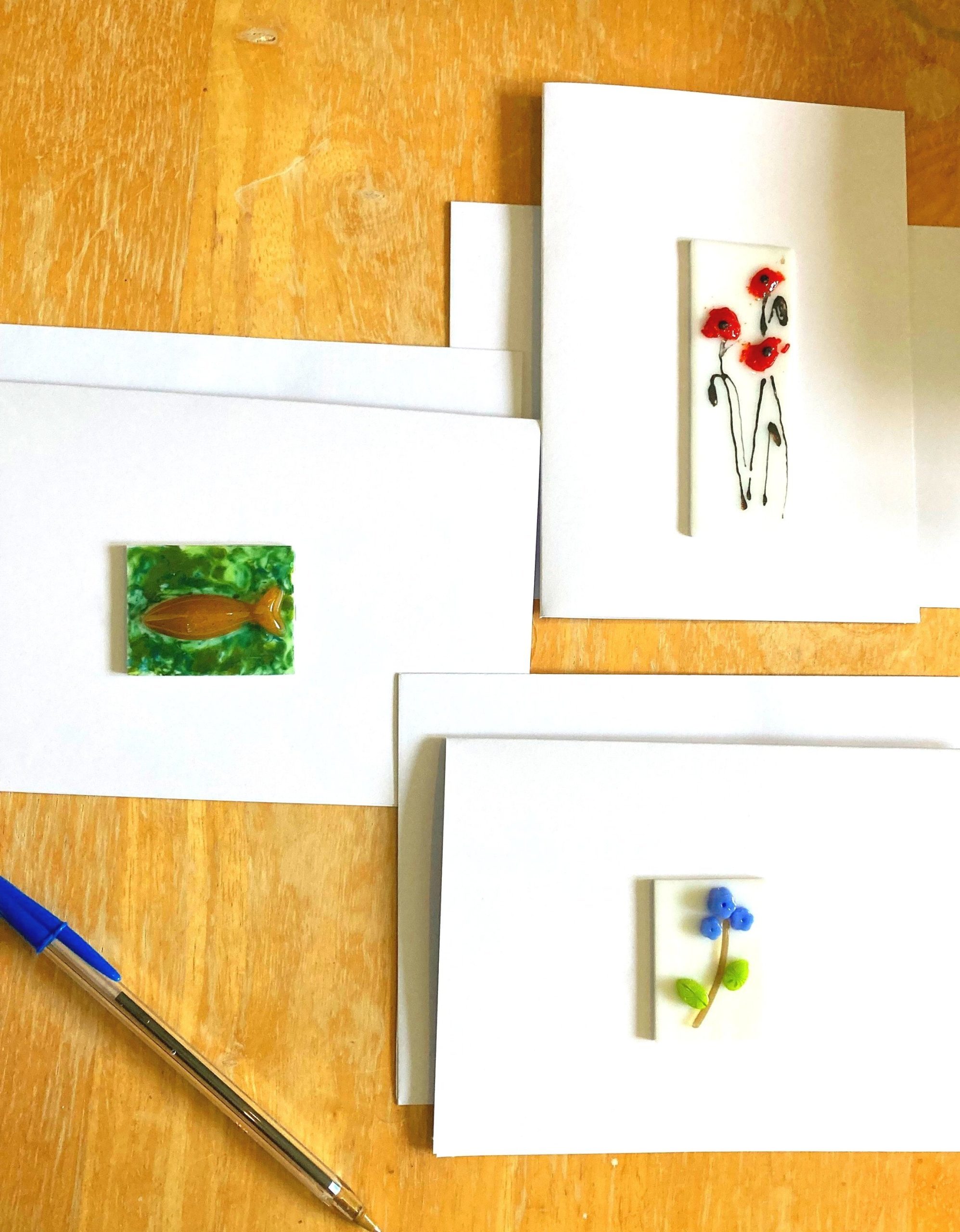 Make 4 of these sweet little mini-art greeting cards. The glass tiles can be attached to a magnet or ribbon for hanging.
